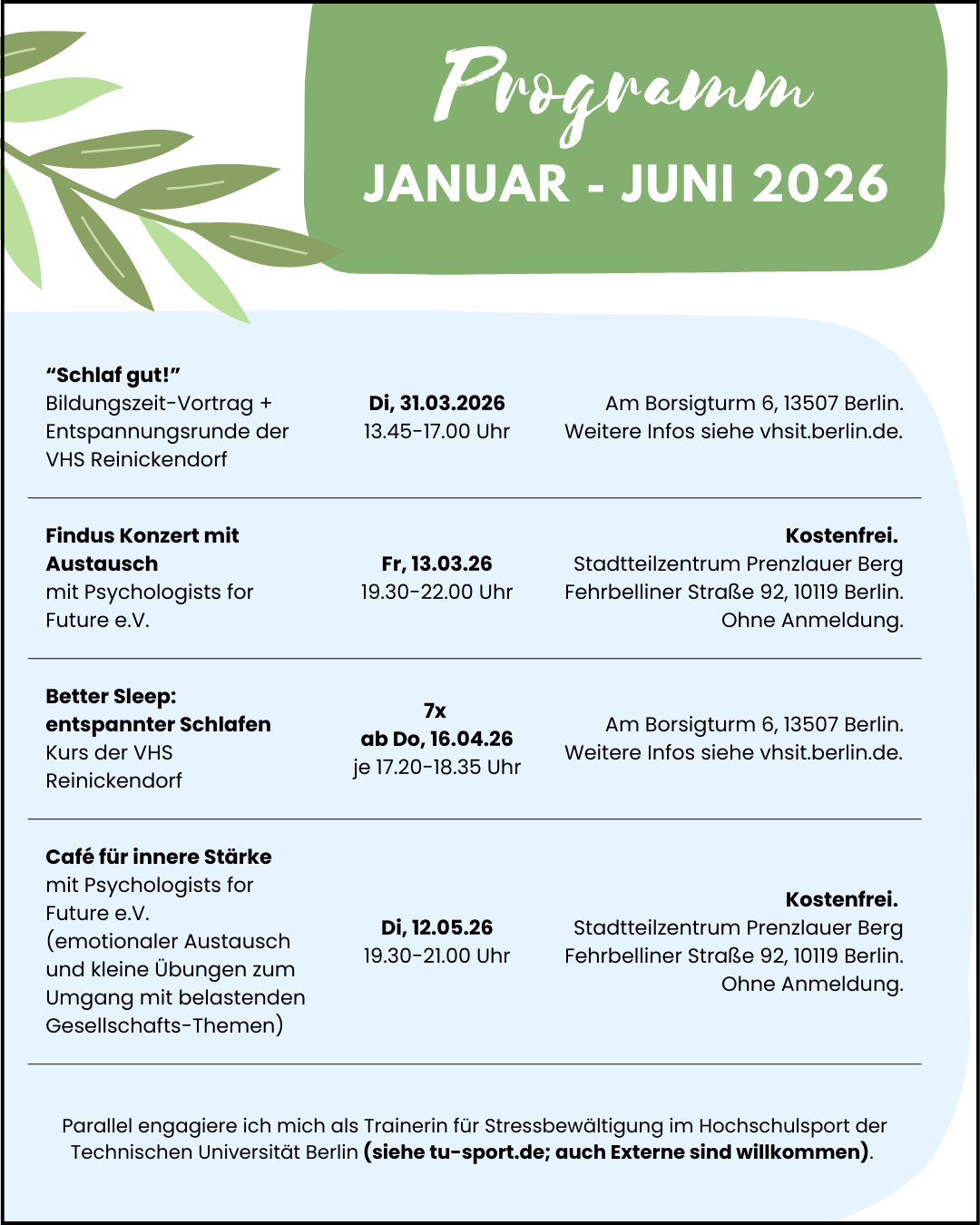 Stressreduktion sollte nicht am Geld scheitern. Deshalb engagiere ich mich ehrenamtlich in der Erwachsenenbildung und zu Anlässen wie der Woche der Seelischen Gesundheit.