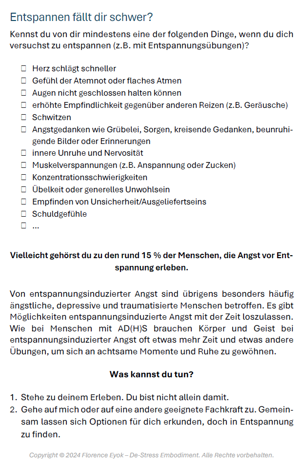 Stressbewältigung, Angstzustände, Schlafstörungen, Spannungskopfschmerzen, Rückenschmerzen, Hypertonie, Verbesserung der Körperwahrnehmung